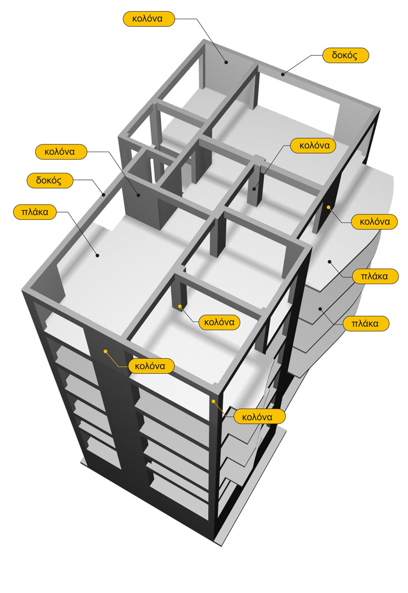 Οριζόντια φέροντα στοιχεία είναι οι πλάκες και οι δοκοί. Κατακόρυφα φέροντα στοιχεία είναι οι κολόνες.