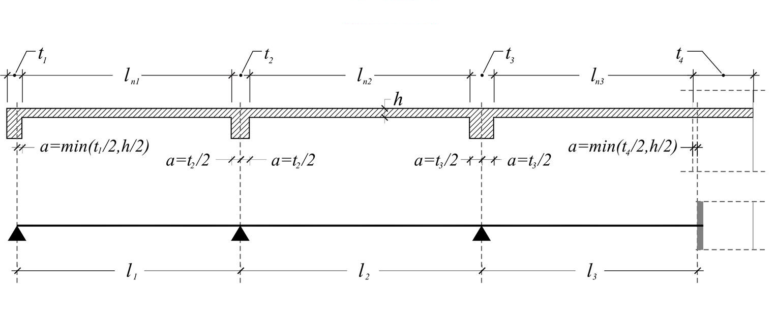Το θεωρητικό άνοιγμα leff μίας πλάκας ή μίας δοκού λαμβάνεται από τη σχέση: l eff =l n +a left +a right όπου ln είναι η καθαρή απόσταση του στοιχείου ανάμεσα στην αριστερή και τη δεξιά παρειά των στηρίξεών του και a=min(t/2,h/2) το πλάτος στήριξης. · Στην ακραία στήριξη της πρώτης πλάκας, η θεώρηση πλάτους a=t1/2=125 mm είναι αποδεκτή δεδομένου ότι, εκτός των άλλων, είναι υπέρ της ασφάλειας. · Στις στηρίξεις δοκών επί κολονών, τα πλάτη στήριξης λαμβάνονται υπόψη πιο αποτελε-σματικά, όταν η ανάλυση γίνεται με χρήση των στερεών σωμάτων (βλέπε §3.1.3). Δίνονται συνεχείς πλάκες με πάχος: t1=250 mm, t2=300 mm, t3=400 mm, t4 =1000 mm, καθαρά ανοίγματα: ln1=3700 mm, ln2=4000 mm, ln3=4000 mm. Τα θεωρητικά ανοίγματα των πλακών ισούνται με: l1=3700+min(250/2,150/2)+300/2=3925 mm l2=4000+300/2+400/2=4350 mm l3=4000+400/2+min(1000/2,150/2)=4275 mm. Παράδειγμα 3.1.1-2 Δίνονται συνεχείς δοκοί με ύψος: t1=250 mm, t2=300 mm, t3=400 mm, t4=1000 mm, καθαρά ανοίγματα: ln1=3700 mm, ln2=4000 mm, ln3=4000 mm. Τα θεωρητικά ανοίγματα των δοκών ισούνται με: l1=3700+min(250/2,500/2)+300/2=3975 mm l2=4000+300/2+400/2=4350 mm l3=4000+400/2+min(1000/2,500/2)=4450 mm.