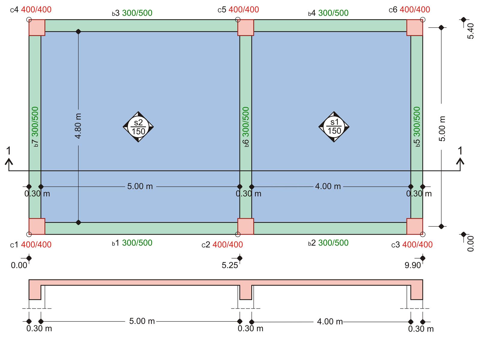 Η ακραία δοκός b5 έχει διατομή 300/500, άνοιγμα l=5.00 m και η πλάκα s1 αριστερά έχει καθαρό άνοιγμα ln1=4.00 m. Ζητείται το συνεργαζόμενο πλάτος της πλακοδοκού.