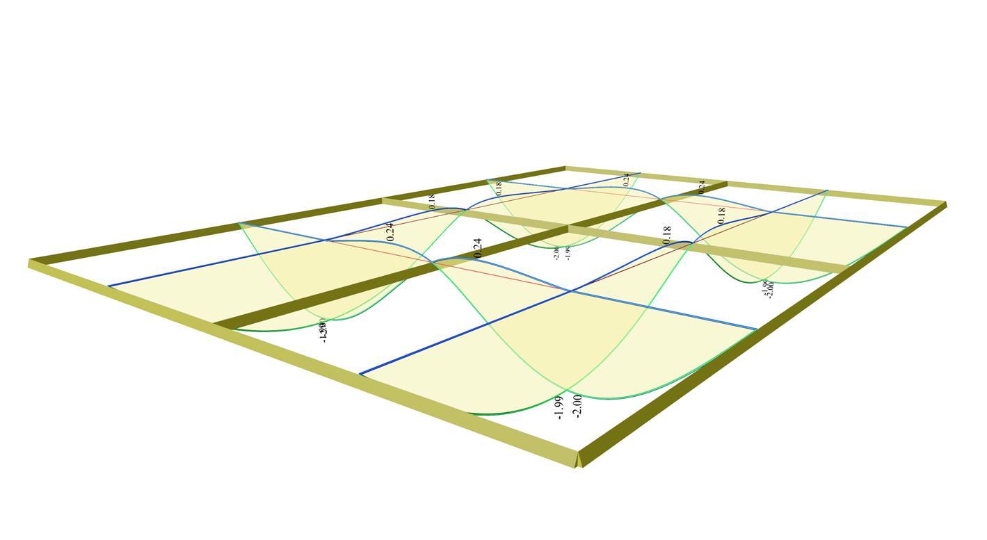Το μεγαλύτερο βέλος των πλακών ισούται με y=-2.00 mm (έναντι -1.53 mm της ενιαίας φόρτισης) και y=+0.24 mm. Συμπεραίνουμε δηλαδή ότι η πλάκα ανασηκώνεται, γεγονός το οποίο δεν συνέβαινε στην ενιαία φόρτιση, λόγω συμμετρίας βέβαια.