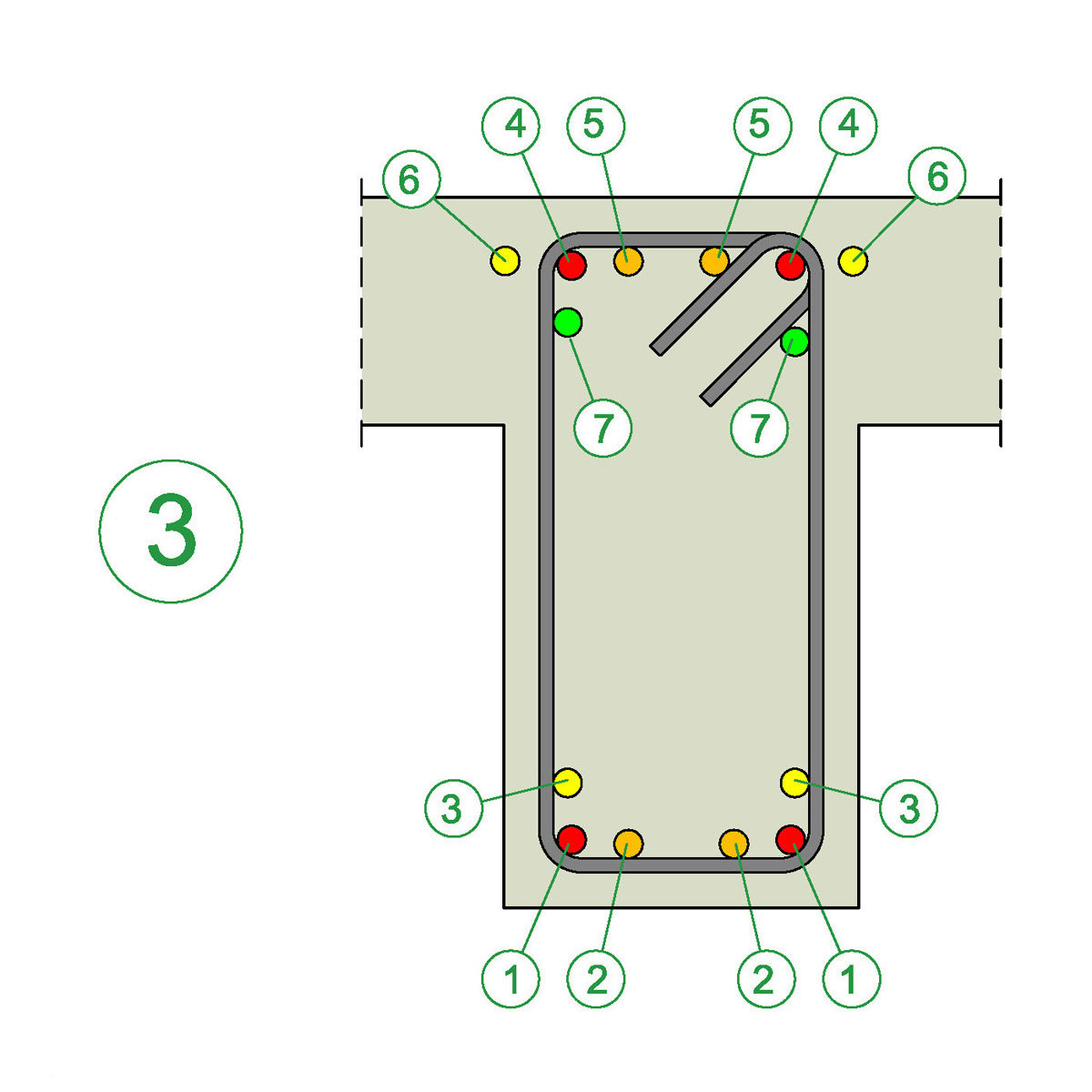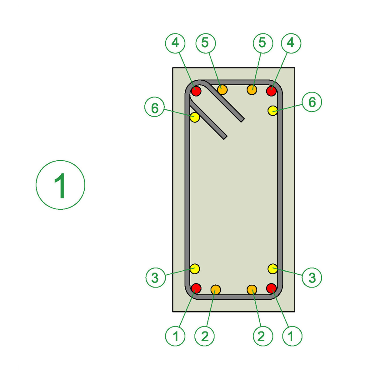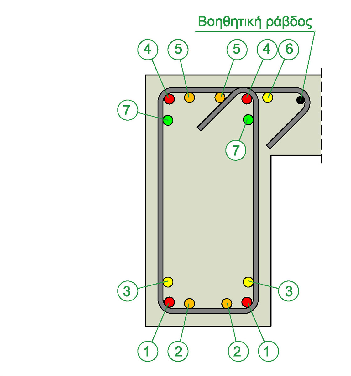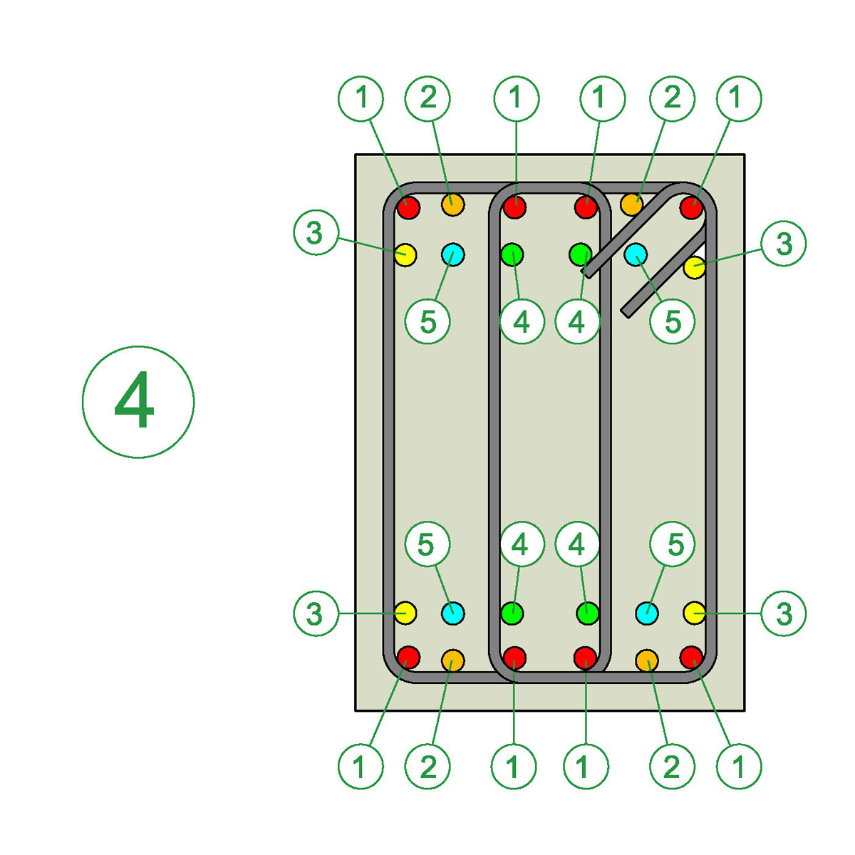Στην περίπτωση (4) φαίνεται η ορθογωνική διατομή δοκού 350/500 με τετράτμητο συνδετήρα, με τις πιθανές θέσεις των ράβδων και τη σειρά προτεραιότητας. Πρώτα τοποθετούνται υποχρεωτικά οι γωνιακές ράβδοι 1, μετά τοποθετείται η μία ράβδος 2, μετά η δεύτερη ράβδος 2 και ακολουθούν οι ράβδοι 3. Αν υπάρχει μεγάλη ανάγκη, που δεν μπορεί να καλυφθεί με αύξηση της διαμέτρου των ράβδων, ακολουθούν μία-μία οι ράβδοι της δεύτερης στρώσης 4 και 5.