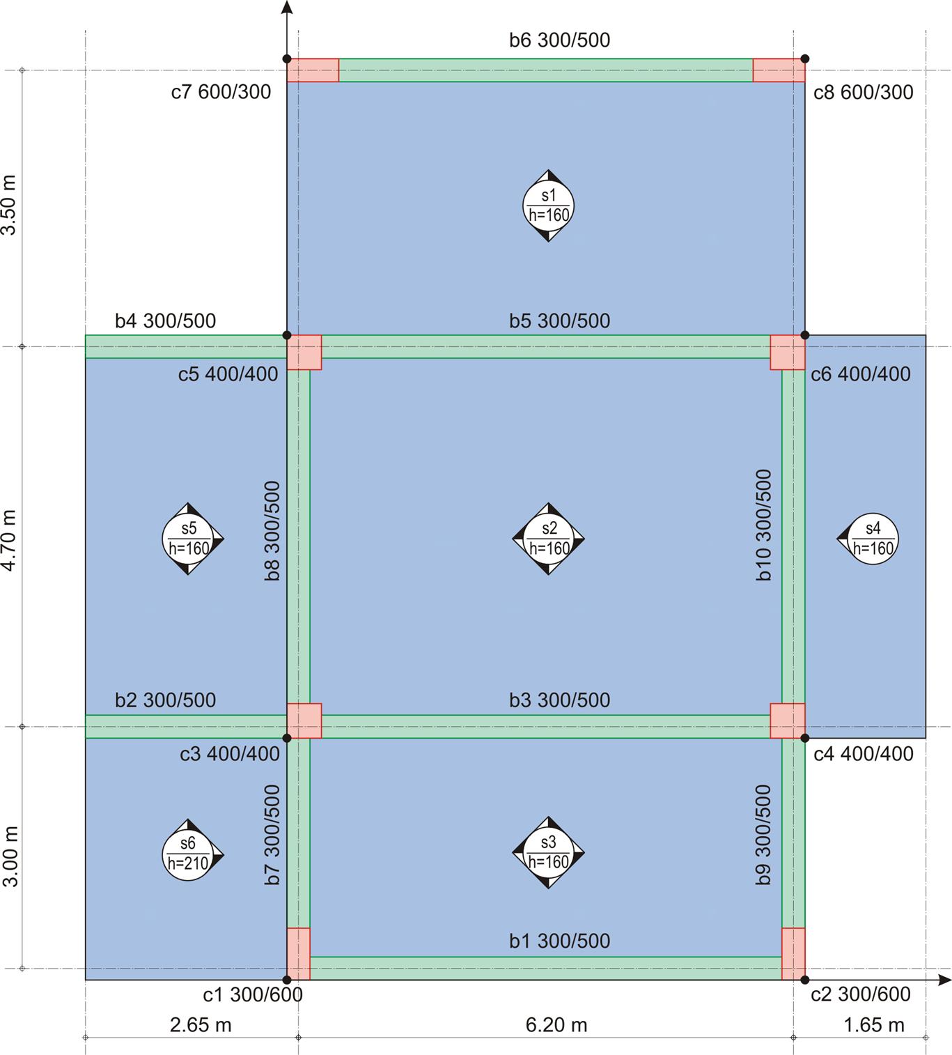 Δίνονται : πάχος πλακών s1, s2, s3, s4, s5 :h=160 mm, s6: h=210 mm και φορτίο επικάλυψης gεπ=2.0 kN/m2. Ζητούμενο : Η στατική επίλυση και η κατανομή των φορτίων των πλακών επί των δοκών.