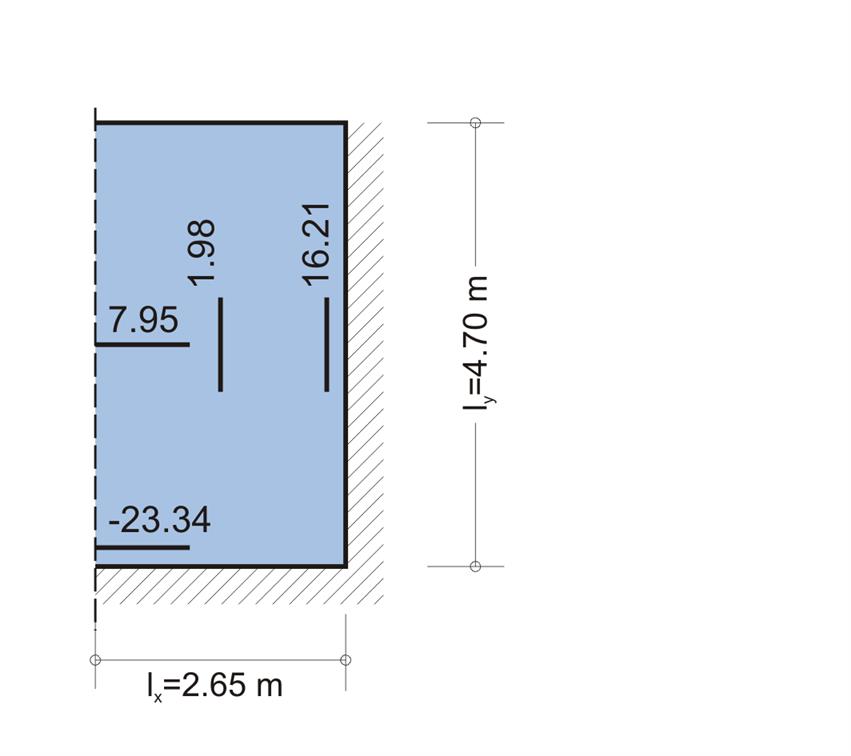 g1,2,3,4,5=0.16 x1.0x25.0=4.0 kN/m2, g6=0.21x1.0x25.0=5.25 kN/m2, gεπ=2.0 kN/m2 Η επίλυση θα διεξαχθεί με καθολικό φορτίο (επειδή η τιμή του κινητού είναι μικρή): p1,2,3,4,5=6.0 x1.35+2.0x1.5=11.1 kN/m2, p6=7.25x1.35+2.0x1.5=12.80 kN/m2 επομένως, σε ζώνη πλάτους 1.0 m αντιστοιχεί φορτίο p1, 2,3,4,5=11.1 kN/m and p6=12.80 kN/m. Πλάκα s1