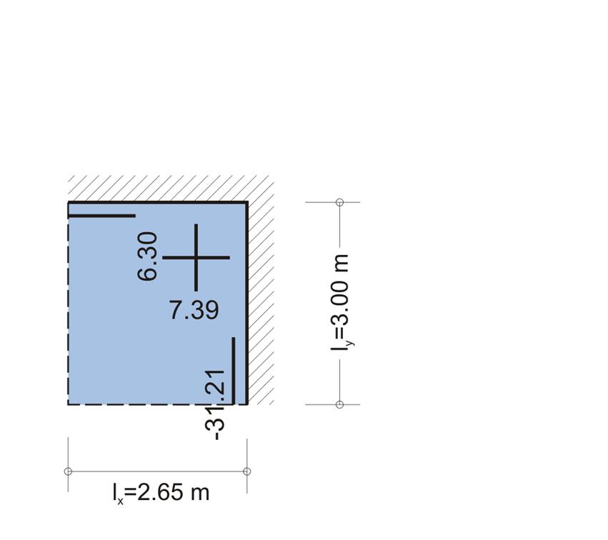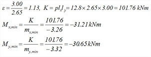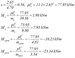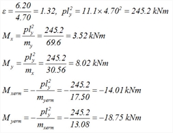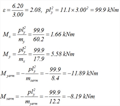 Η τριγωνική επιφάνεια επιρροής του φορτίου της πλάκας s5 έχει εμβαδόν 1.53x2.65/2=2.03 m 2 η οποία δίνει φορτίο 2.03m 2 x11.1kN/m 2 =22.53 kN και τελικά ομοιομορφισμένο φορτίο 22.53kN/2.65m= 8.5 kN/m . επειδή η επιφάνεια επιρροής είναι ορθογωνική, το ομοιομορφισμένο φορτίο προκύπτει άμεσα ως 2.22mx11.1kN/m2=24.6 kN/m. η τραπεζοειδής επιφάνεια επιρροής έχει εμβαδόν (6.20+2.49)x2.35/2=10.21 m2 η οποία δίνει φορτίο 10.21m2x11.1kN/m 2=113.33kN και τελικά ομοιομορφισμένο 113.33kN/6.20m=18.3 kN/m. Συνολικά: ομοιομορφισμένο δοκού b5 = 24.6 + 18.3=42.9 kN/m Οι ισοδύναμες ομοιόμορφες φορτίσεις προκύπτουν άμεσα από πίνακες. Για παράδειγμα, από τον πίνακα 50-2 για την κατανομή της πλάκας s2 επί της δοκού b5, προκύπτει: pyerm=υχerm x p x ly =0.35x11.1x4.70=18.3 kΝ/m, ενώ από τον πίνακα 55 για την κατανομή της πλάκας s5 επί της δοκού b4, προκύπτει: pyr=υxr x p x lx =0.29x11.1x2.65=8.5 kΝ/m.