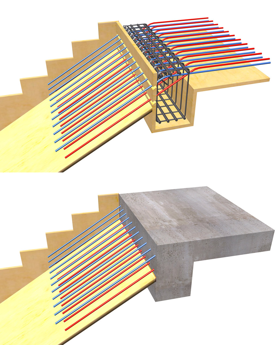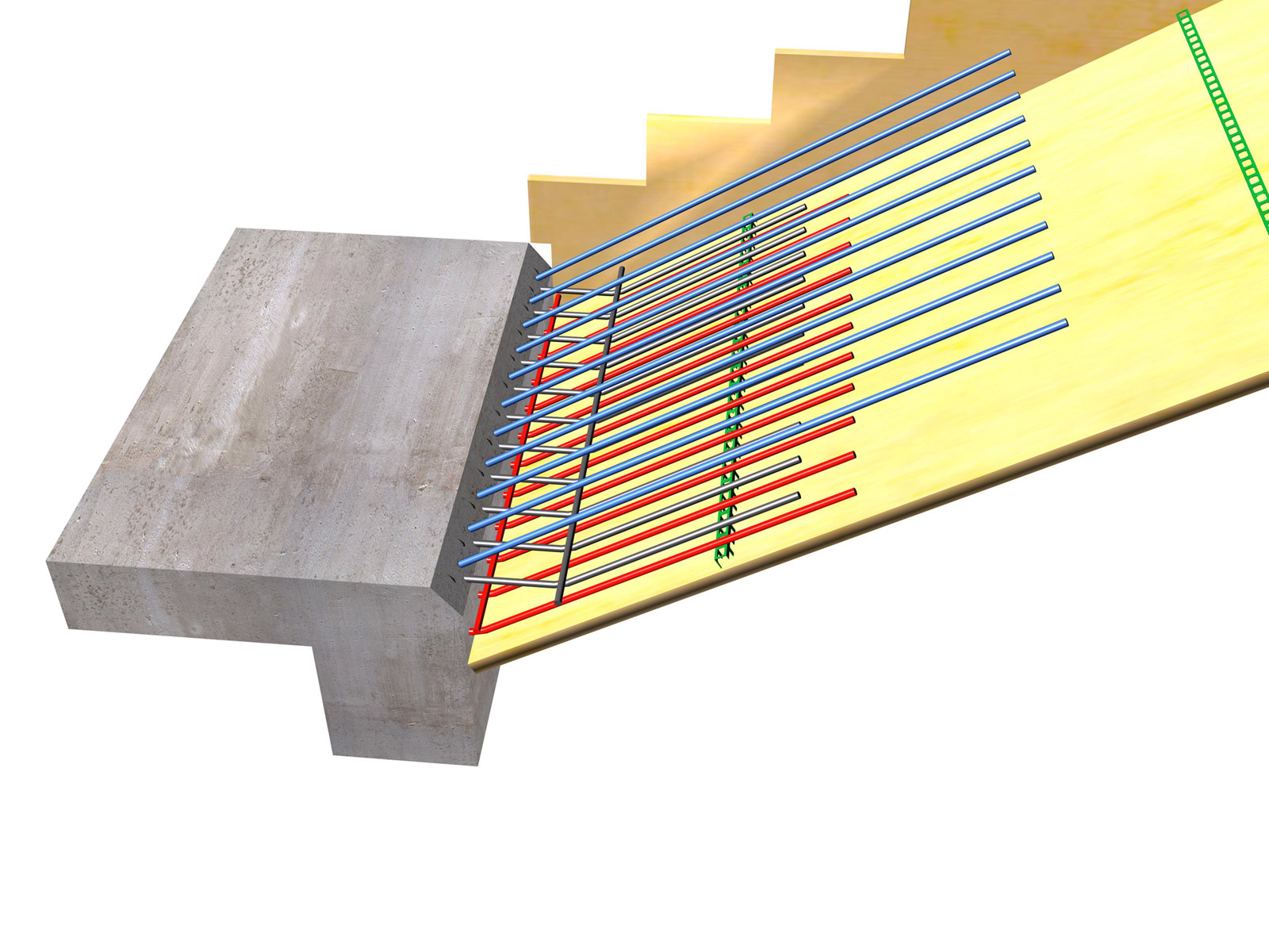 Στην κορυφή της σκάλας το σιδέρωμα γίνεται κανονικά, δεδομένου ότι η σκάλα θα σκυροδετηθεί μονολιθικά με τις πλάκες-δοκούς του ορόφου. Γίνεται όμως πρόβλεψη και τοποθετούνται οι αναμονές για την επόμενη σκάλα.