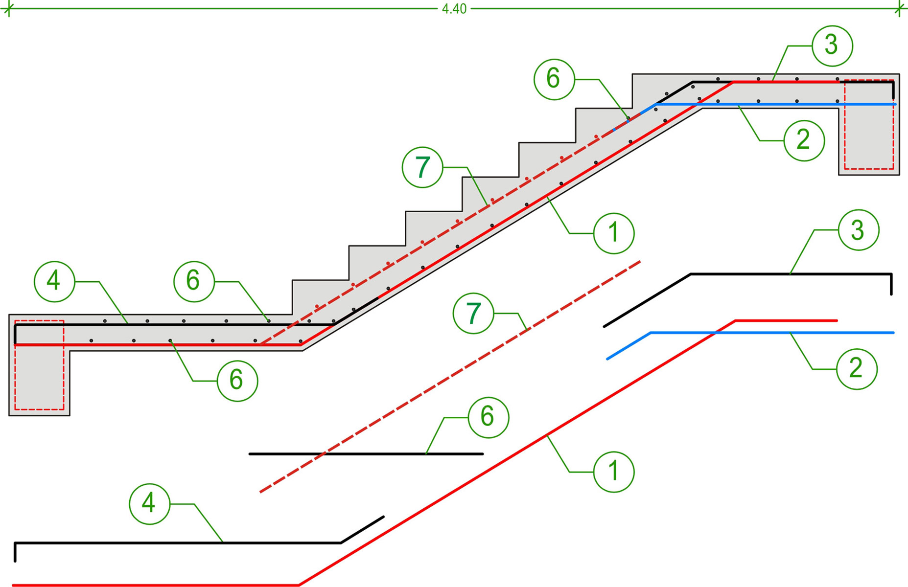 Όταν η σκάλα συμμετέχει στη σεισμική διαφραγματική λειτουργία των ορόφων (πράγμα που αποτελεί και τον κανόνα), συνιστάται η χρήση και των αρνητικών ράβδων [διακεκομμένη ράβδος (7)] Παρατηρήσεις: