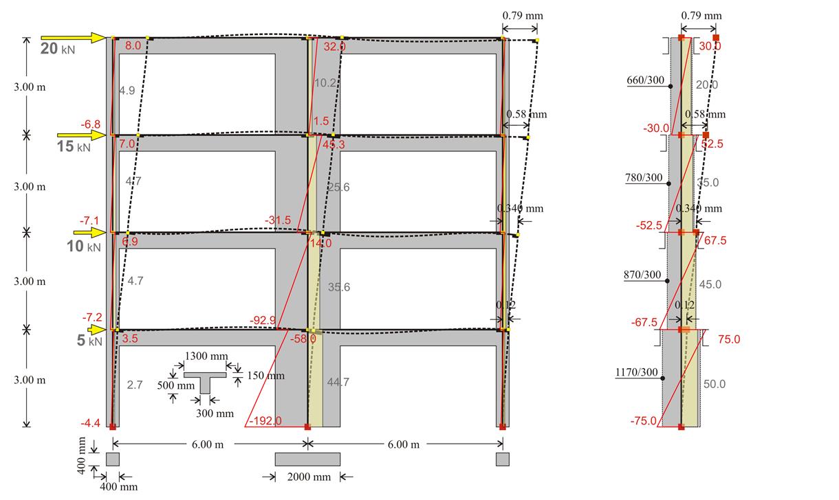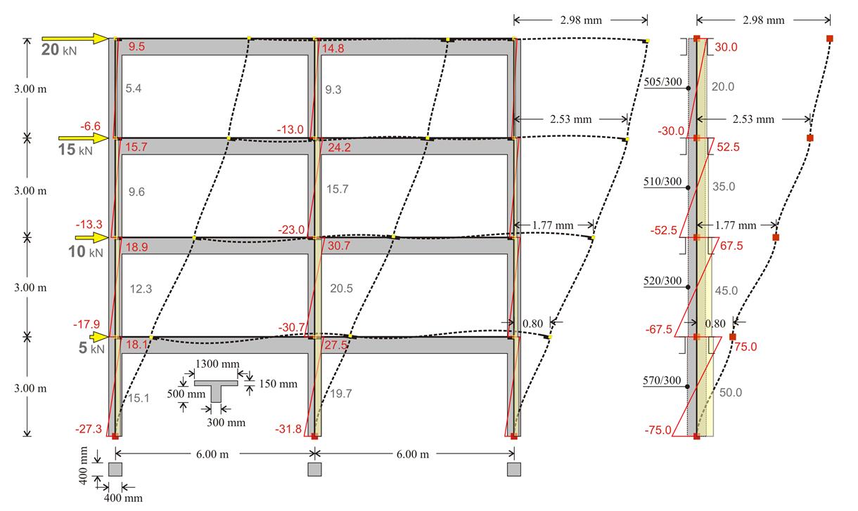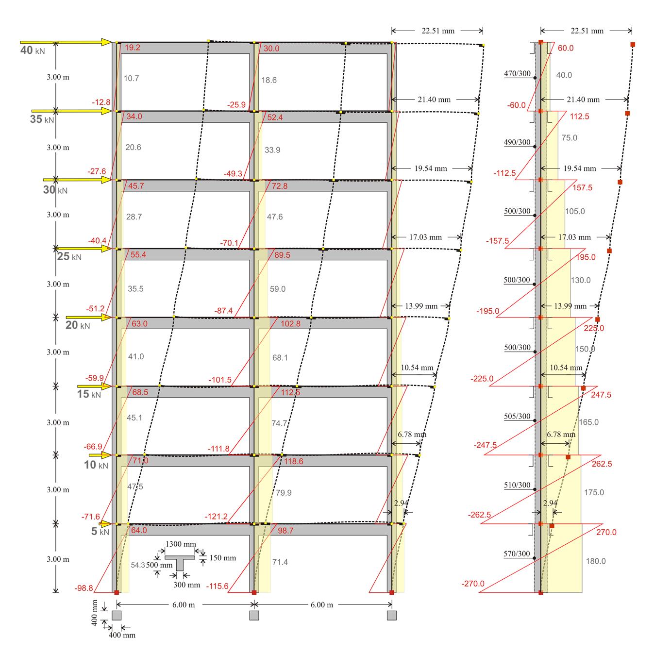 • Τόσο για πλαισιακό όσο και για μικτό σύστημα, σε κάθε υποστύλωμα ισχύει Mo-Mu=V· h, όπου Mo είναι η ροπή στην κεφαλή της κολόνας, Mu η ροπή στον πόδα, V η τέμνουσα της κολόνας και h το ύψος της. Για παράδειγμα, στο μεσαίο υποστύλωμα του προηγούμενου φορέα ισχύει 98.7-(-115.6)=71.4·3.0 (214.3≈214.2).