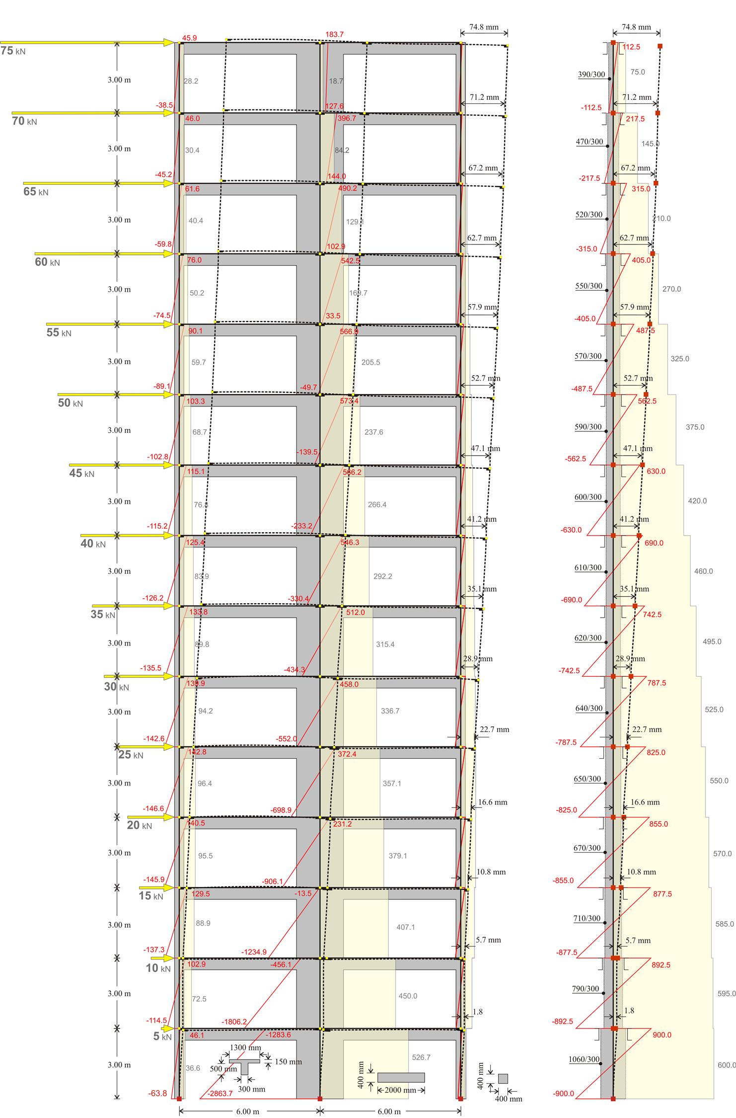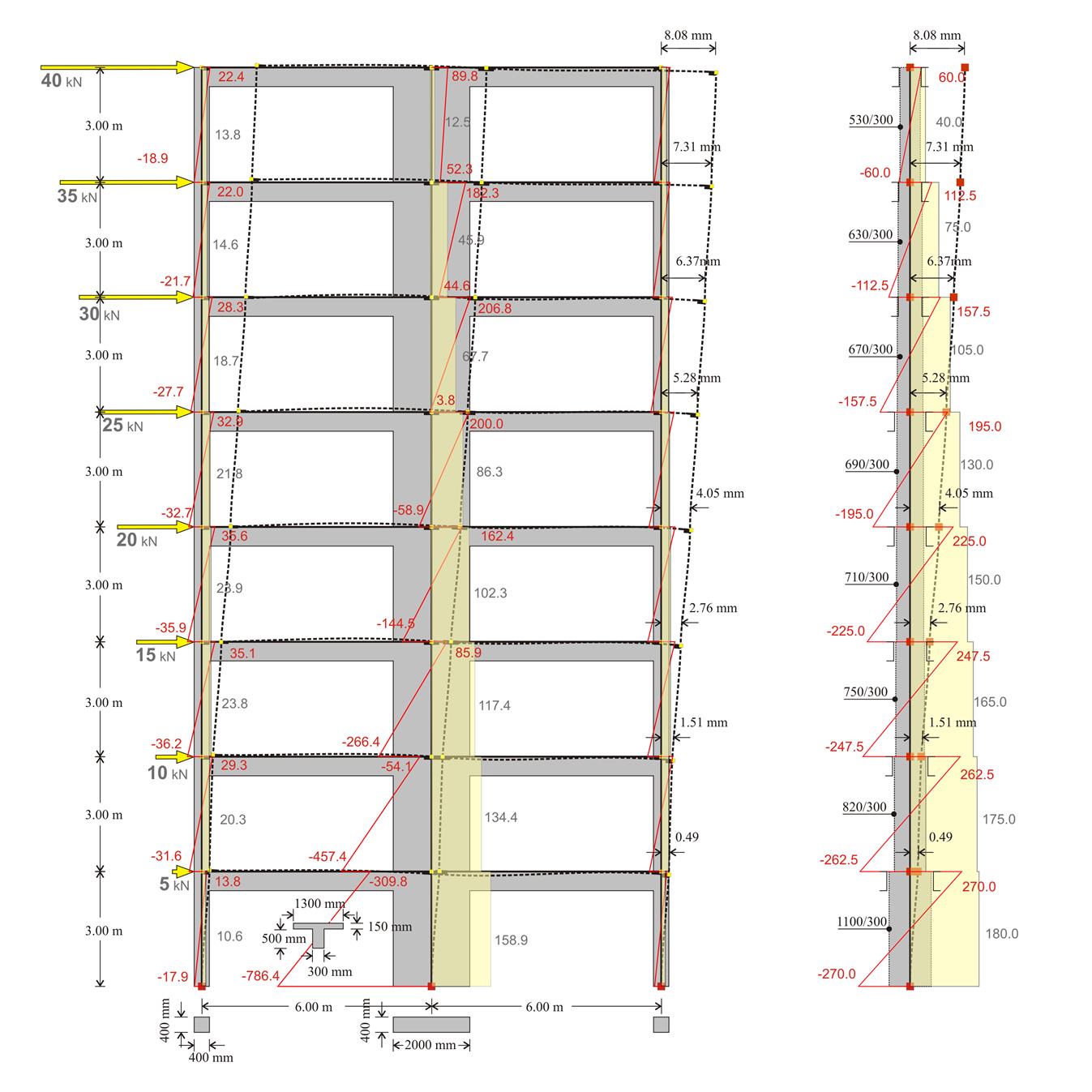 • Στην πρώτη στάθμη ισχύει 10.6+158.9+10.6=180. Το μεσαίο τοιχίο αναλαμβάνει το 158.9/180=88% της συνολικής τέμνουσας, ενώ τα δύο ακραία υποστυλώματα το 11% το καθένα. Στην τελευταία στάθμη ισχύει 13.8+12.5+13.8=40. Το τοιχίο αναλαμβάνει το 12.5/40=32% της συνολικής τέμνουσας, ενώ κάθε υποστύλωμα το 34% αντίστοιχα. Συ-μπεραίνουμε ότι στο ισόγειο το τοιχίο ανακουφίζει τα υποστυλώματα, ενώ στον τελευταίο όροφο τα επιβαρύνει.