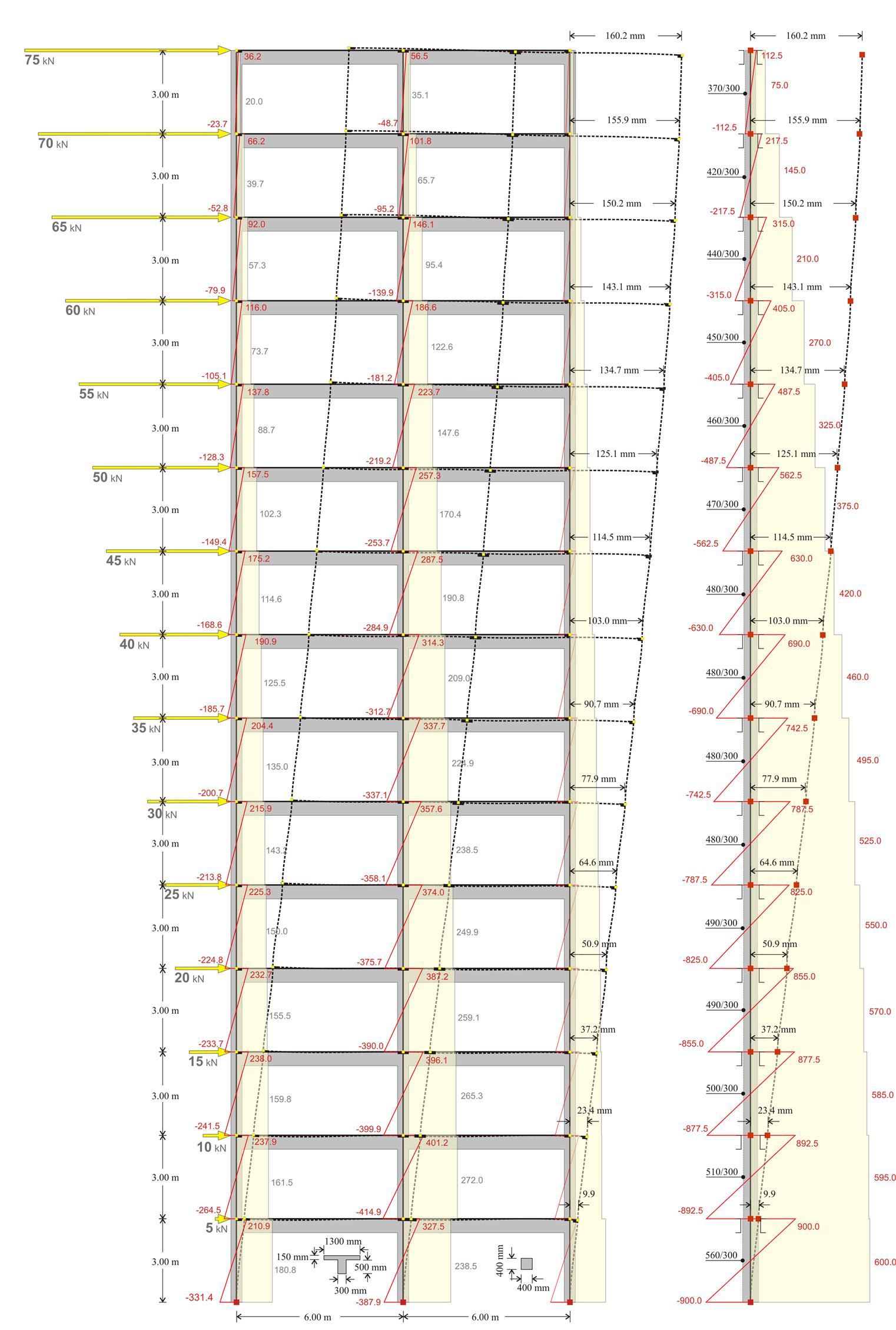 • Η σχέση Mo-Mu=V·h, ισχύει τόσο για τα υποστυλώματα, όσο και για τα τοιχία. Ενδεικτικά, για το τοιχίο της πρώτης στάθμης ισχύει -309.9-(-786.4)=158.9·3.0 (476.5≈476.7), ενώ για το τοιχίο της τελευταίας στάθμης ισχύει 89.8-52.3=12.5·3.0 (37.5=37.5).