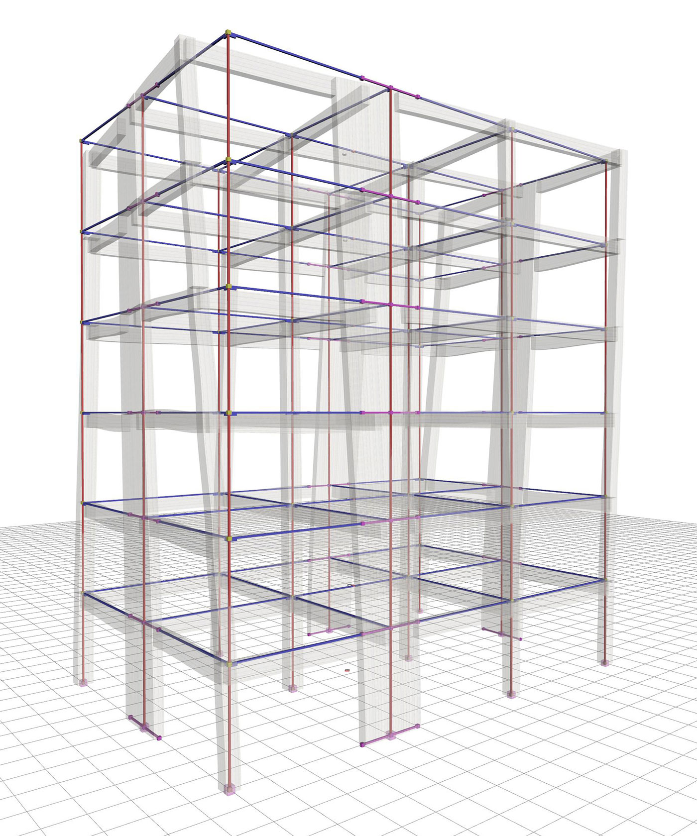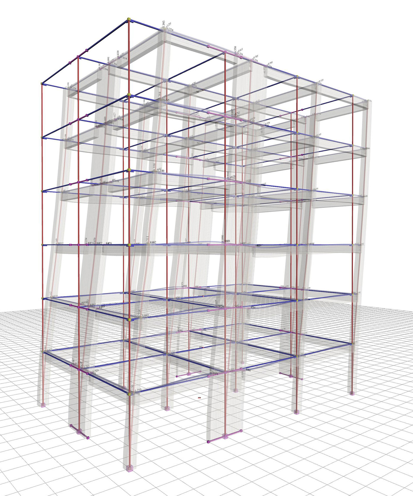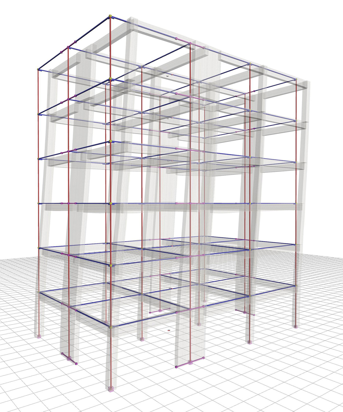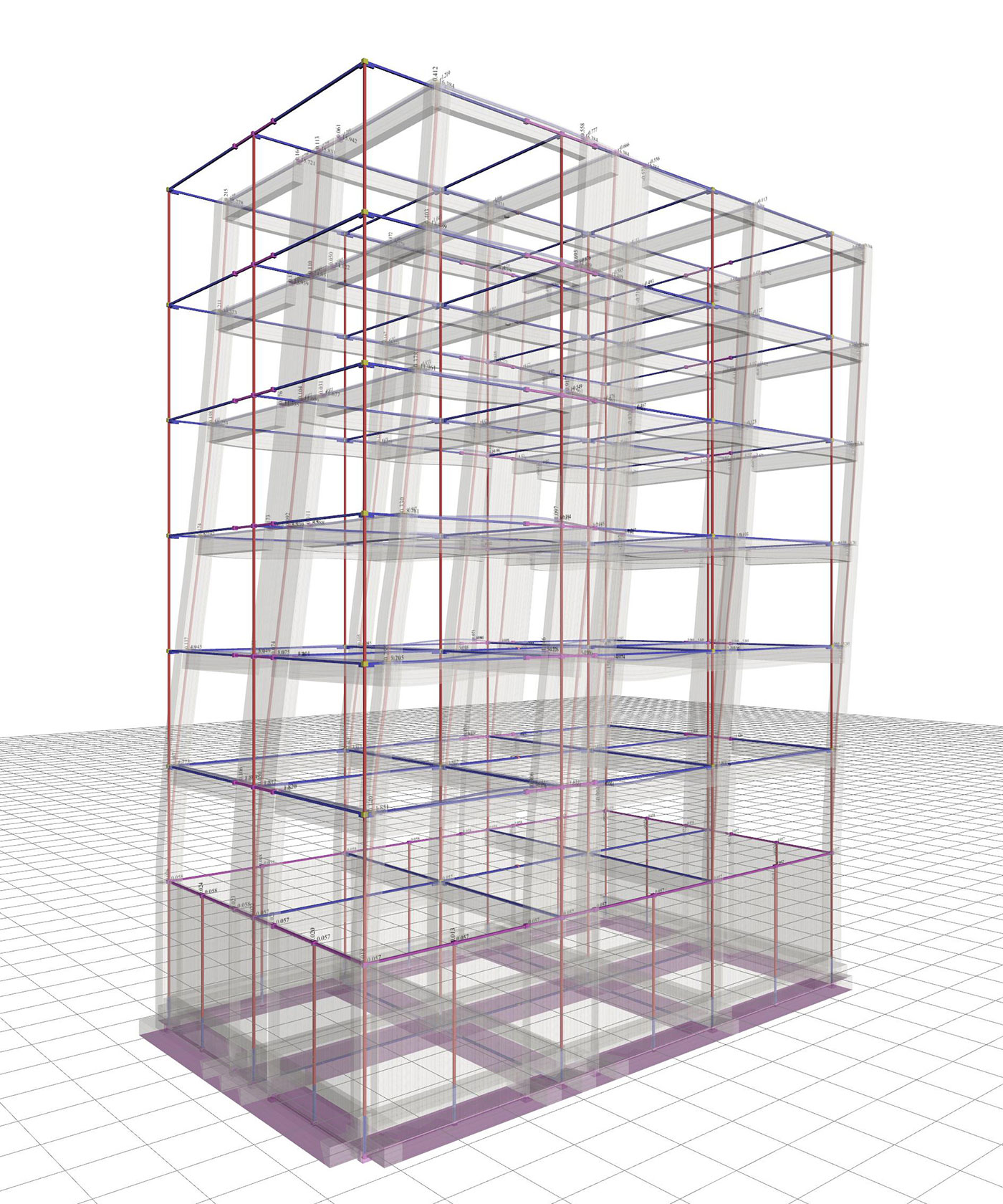 | Ο συντελεστής συμπεριφοράς του πλάστιμου τοιχωματικού συστήματος έχει προκύψει q=3.60 που είναι ο καλύτερος για σύστημα ΚΠΜ, φορέων τέτοιου τύπου. Η μετακίνηση του τοιχωματικού φορέα είναι σημαντικά μικρότερη του αντίστοιχου πλαισιακού της προηγούμενης παραγράφου (16.3 mm έναντι 24.5 mm). Το συντριπτικό μέρος της ροπής της πρώτης στάθμης, αναλαμβάνεται από τα τοιχία. 2η περίπτωση: Θεμελίωση με πεδιλοδοκούς (μελέτη <Β_642-2>)