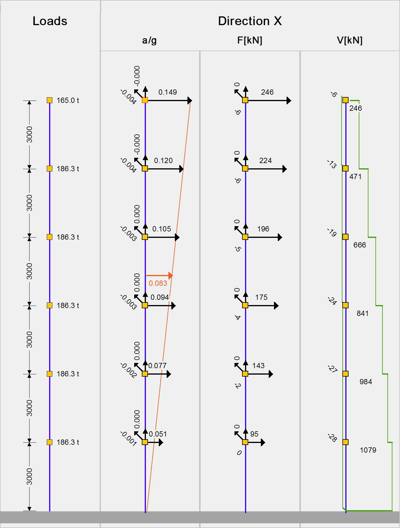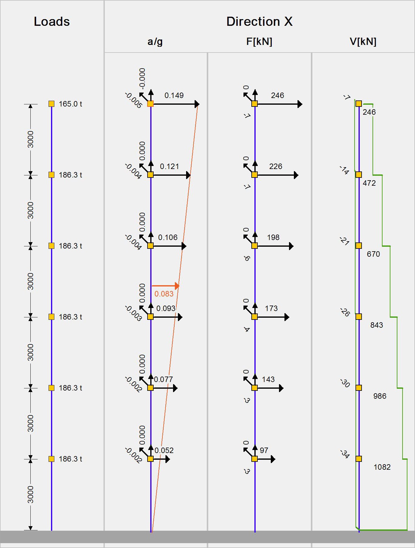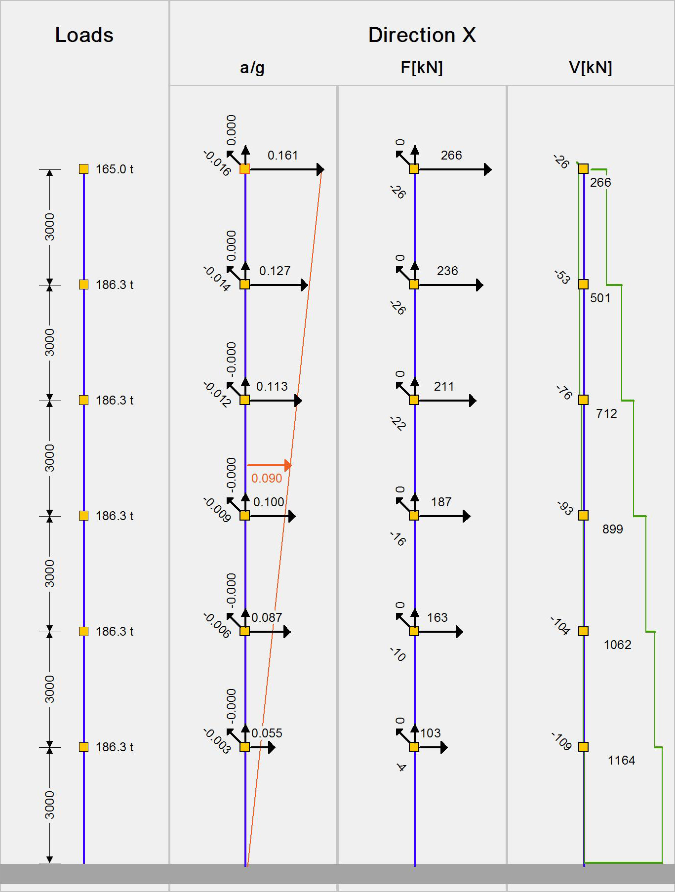 Εικόνα 6.4.2-12: Σεισμικές επιταχύνσεις-δυνάμεις-τέμνουσες. 1η κυρίαρχη ιδιοπερίοδος:T1X=0.709 sec, συμμετοχή 75% Εικόνα 6.4.2-12: Σεισμικές επιταχύνσεις-δυνάμεις-τέμνουσες. 1η κυρίαρχη ιδιοπερίοδος:T1X=0.709 sec, συμμετοχή 75%