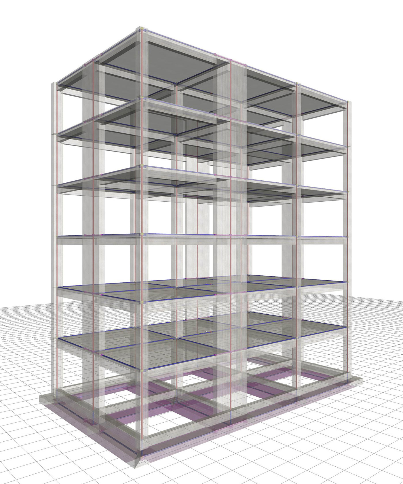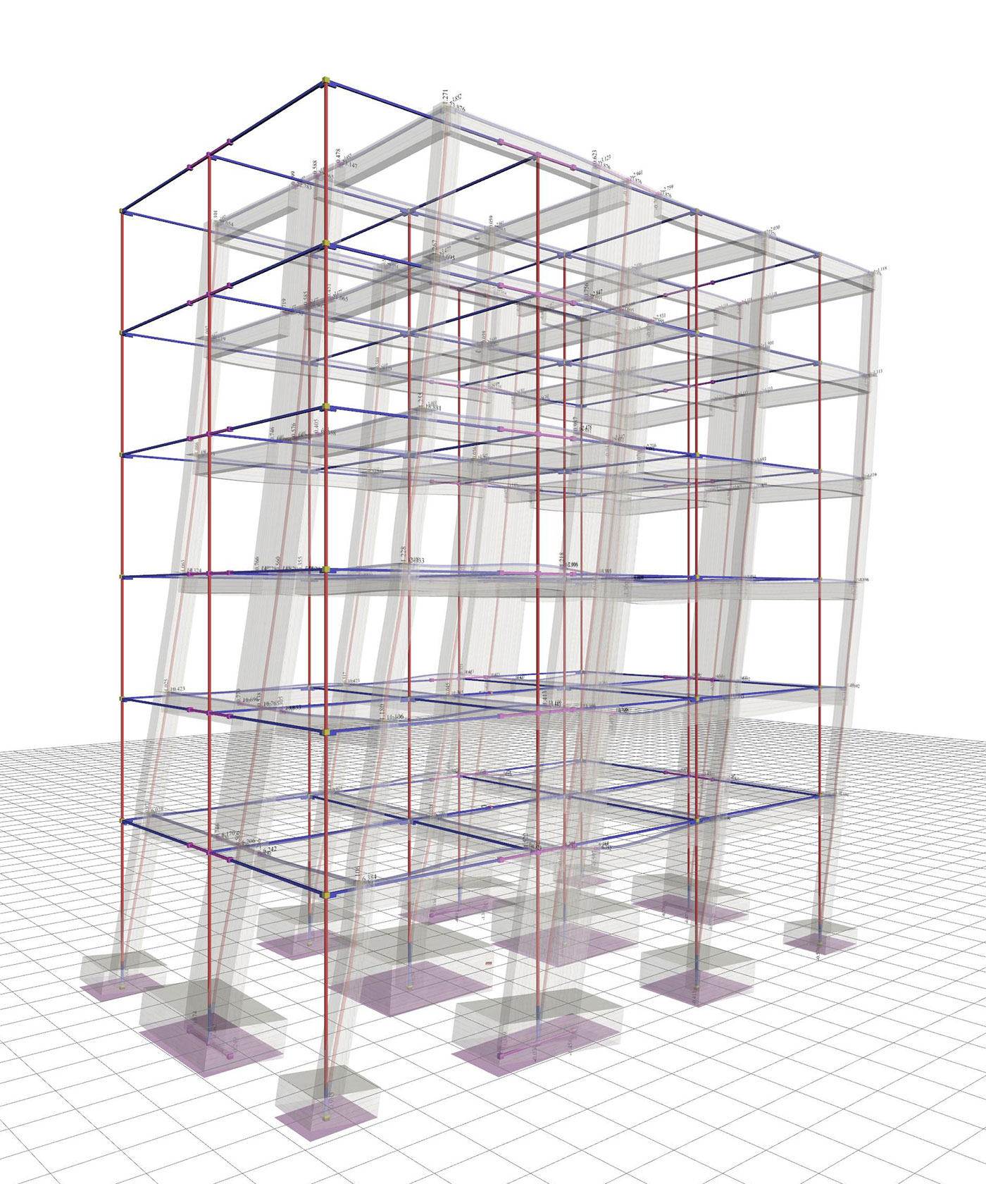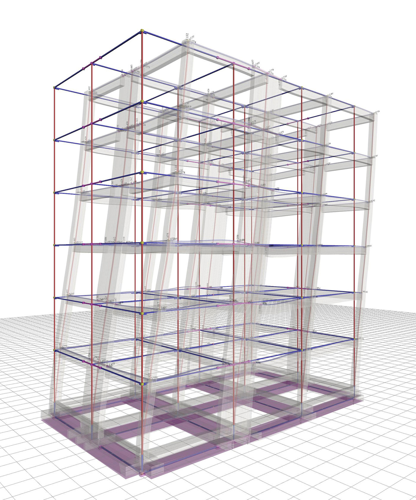 | Οι διατομές των πεδιλοδοκών δεν είναι αρκετά ισχυρές, για τις μεγάλες ροπές κάμψης των περιμετρικών τοιχίων, με αποτέλεσμα το στατικό σύστημα κατά y να μεταπίπτει σε διπλό τοιχωματικό και τελικά να προκύπτει ενιαίο q=3.00. Επίσης, η μετακίνηση του συστήματος κατά x είναι 21.3 mm σε σχέση με τα 25.7 mm του αντίστοιχου πλαισιακού. Οι ροπές των τοιχίων είναι μικρότερες ενώ των υποστυλωμάτων μεγαλύτερες, έναντι της 1ης περίπτωσης. 3η περίπτωση: Θεμελίωση με απλά πέδιλα (μελέτη <Β_642-3>)