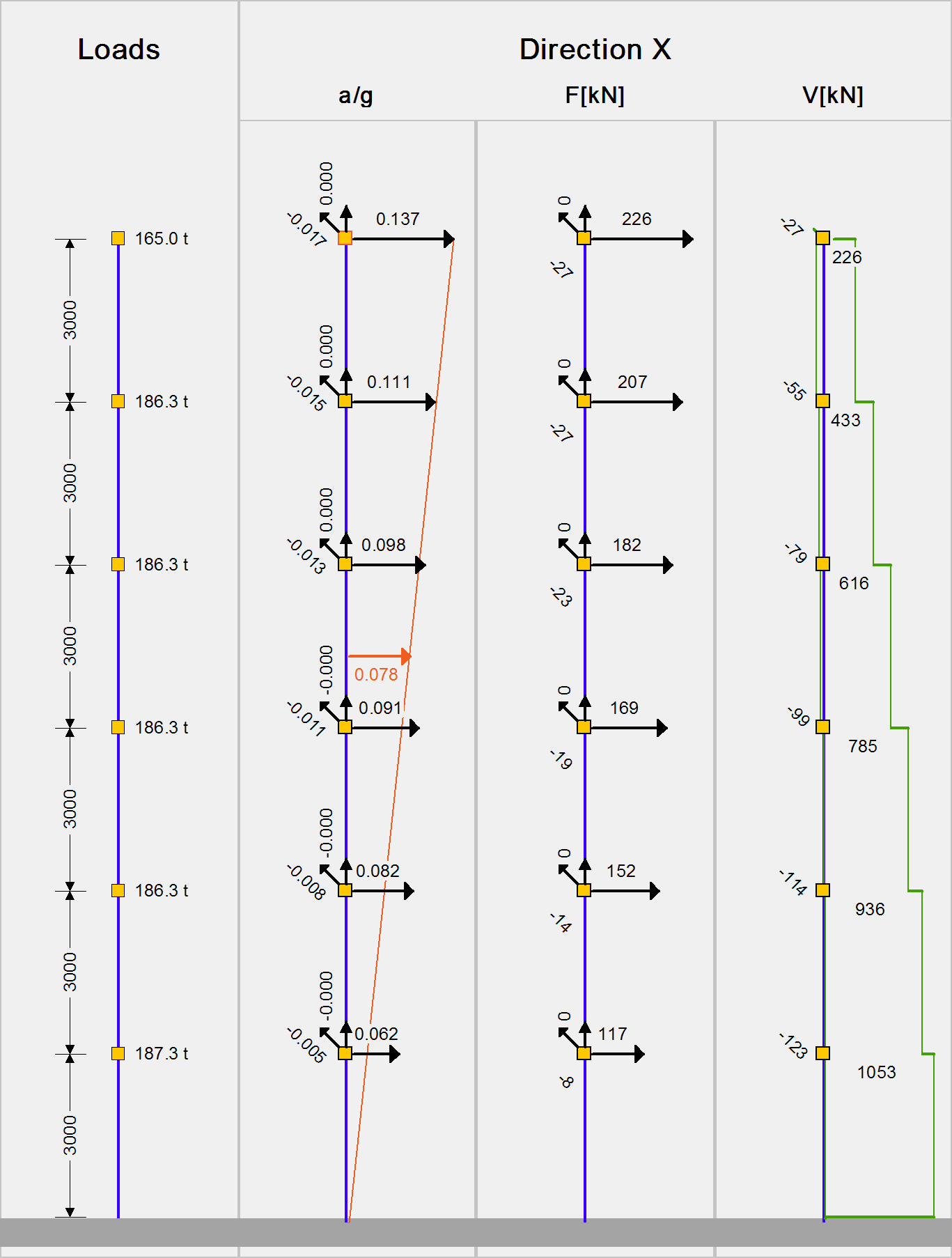 Εικόνα 6.4.2-17: Σεισμικές επιταχύνσεις-δυνάμεις-τέμνουσες. 1η κυρίαρχη ιδιοπερίοδος:T1X=0.818 sec, συμμετοχή 78% Εικόνα 6.4.2-17: Σεισμικές επιταχύνσεις-δυνάμεις-τέμνουσες. 1η κυρίαρχη ιδιοπερίοδος:T1X=0.818 sec, συμμετοχή 78%