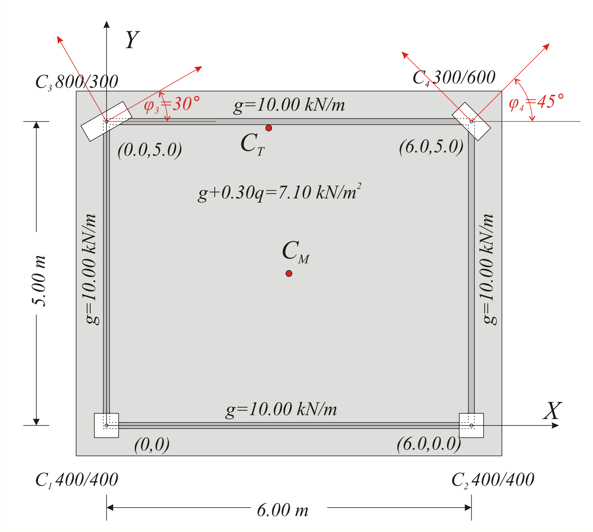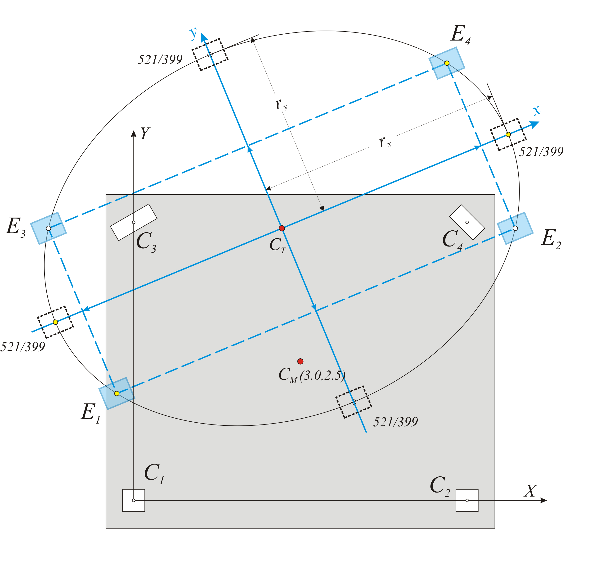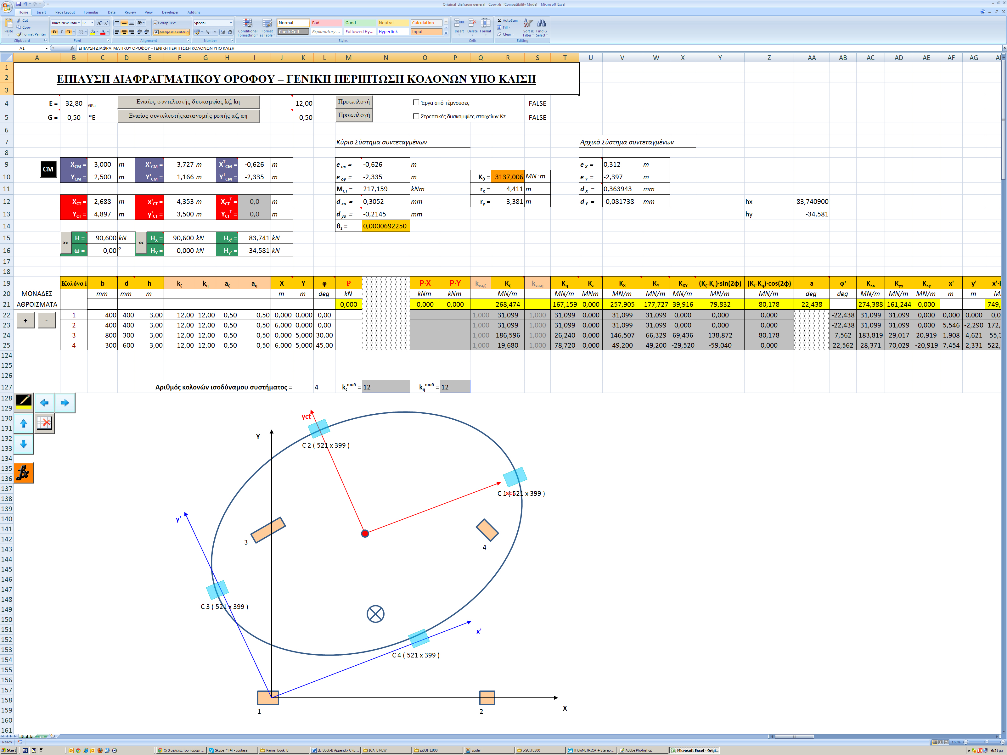 7. Μεταφέρουμε τις συντεταγμένες x ’, y ’ του κέντρου μάζας CM του διαφράγματος και του κέντρου βάρους κάθε κολόνας στο κύριο σύστημα αξόνων και υπολογίζουμε τις στατικές εκκεντρότητες eox , eoy του φορέα από τις σχέσεις (6)