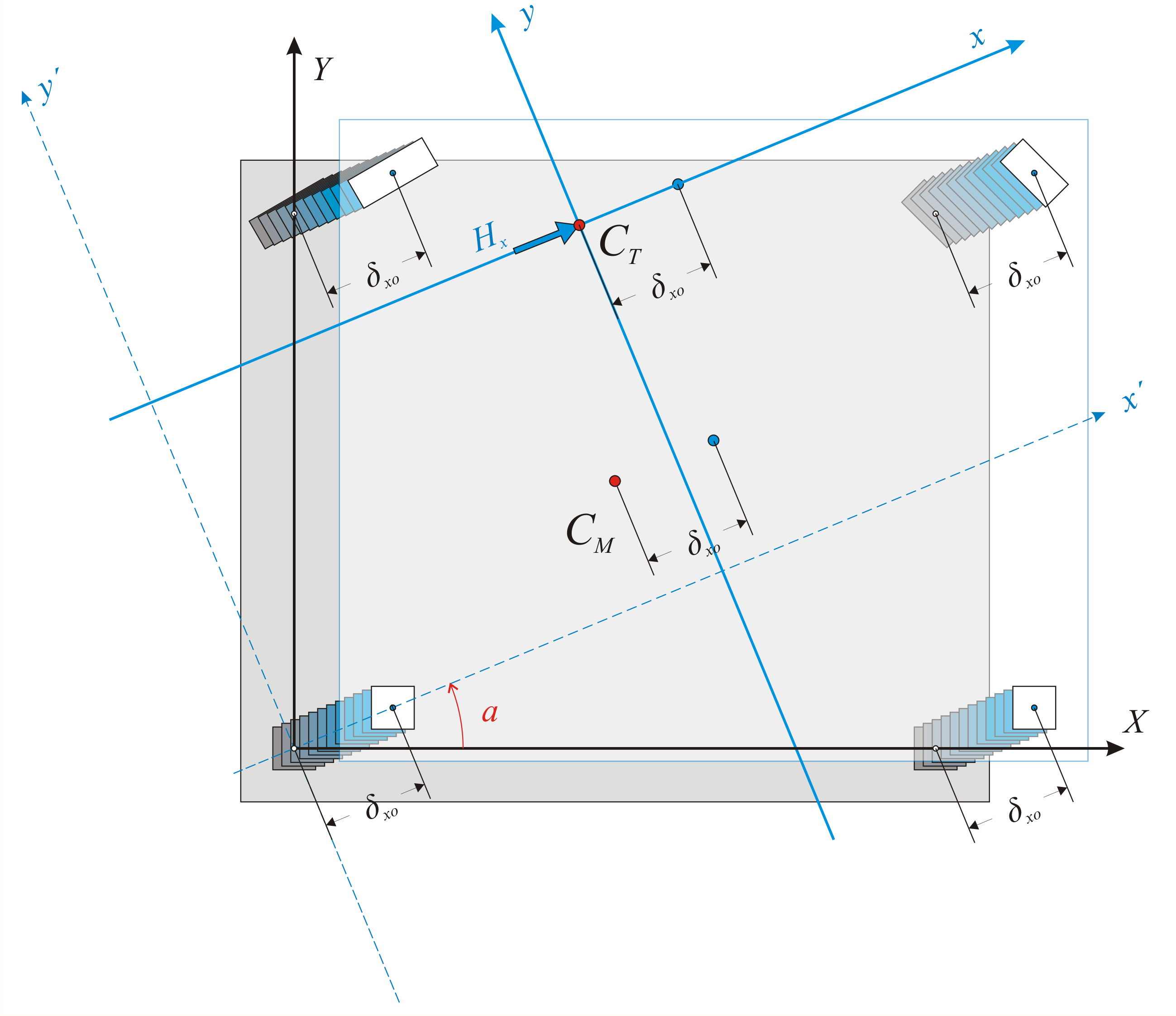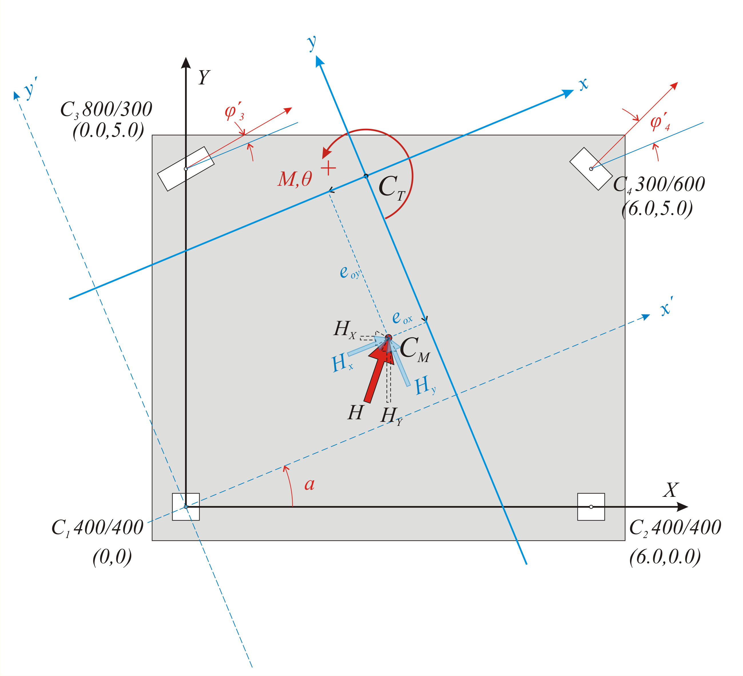 Από αυτή τη σχέση υπολογίζεται η γωνία a [*]NoteNoteΑν όλες οι κολόνες είναι ορθογωνικές και παράλληλες προς το αρχικό σύστημα, όλες οι γωνίες φi είναι μηδενικές, επομένως προκύπτει ότι tan2a=0 → a=0 κατά συνέπεια το κύριο σύστημα είναι παράλληλο προς το αρχικό. του κυρίου συστήματος, του οποίου όμως δεν γνωρίζουμε ακόμη τις συντεταγμένες xCT, yCT του πόλου περιστροφής CT. Μπορούμε να εργασθούμε στο βοηθητικό σύστημα x’0y’ που είναι παράλληλο προς το xCTy και έχει το πλεονέκτημα ότι οι δυσκαμψίες του είναι ίδιες με αυτές του τελικού κύριου συστήματος xCTy. Μεταφέρουμε επομένως τις συντεταγμένεςX,Y στις x’,y’.