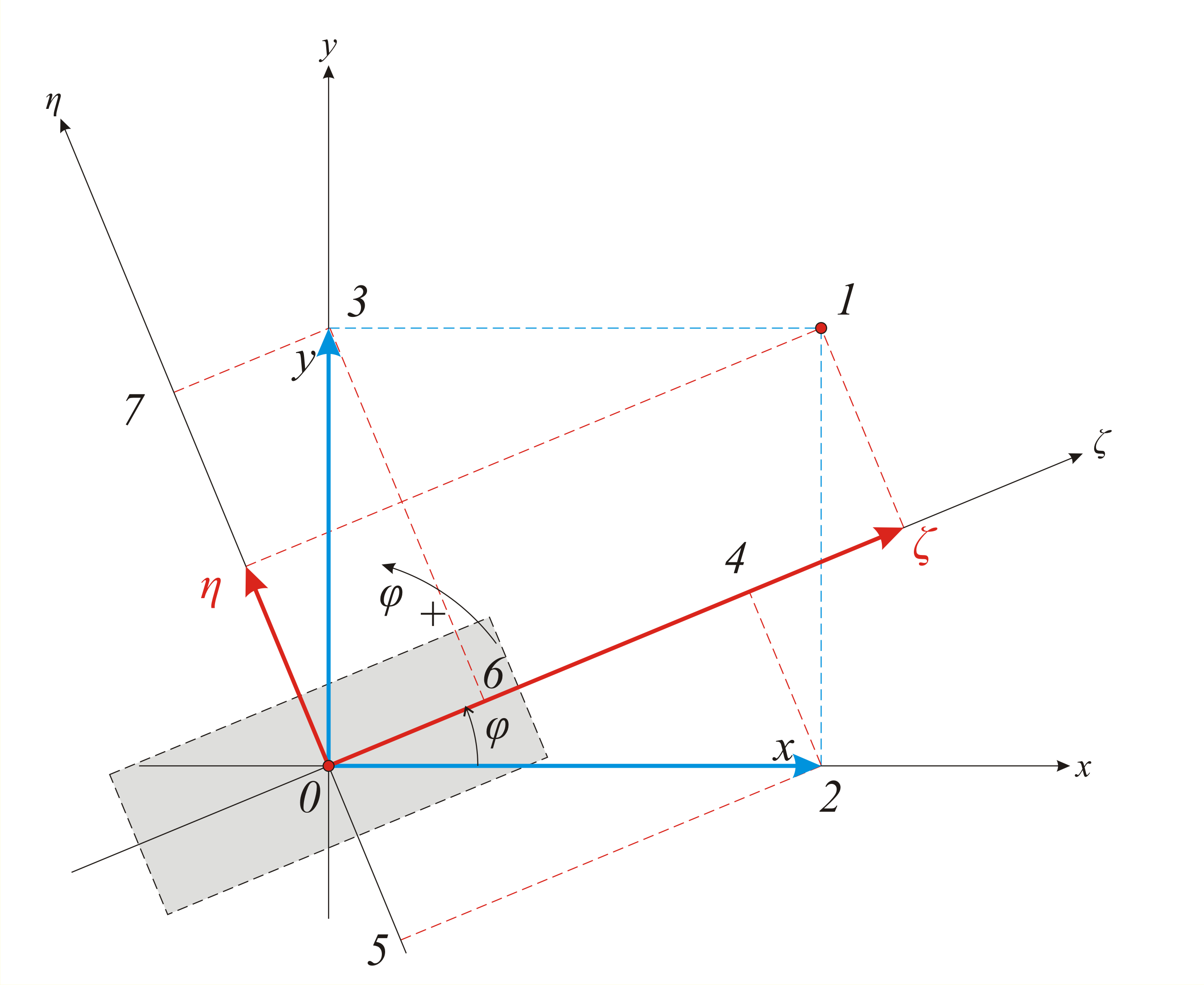Είναι χρήσιμο να θυμηθούμε τους τύπους μεταφοράς ενός διανύσματος v(x,y) από ένα σύστημα x0y σε ένα ισοδύναμο διάνυσμα v(ζ,η) που αντιστοιχεί στο σύστημα συντεταγμένων ζ0η, που έχει γωνία κλίσης φ σε σχέση με το αρχικό σύστημα. Το διάνυσμα αυτό μπορεί να είναι μετατόπιση, ή δύναμη, ή να αντιστοιχεί σε σημείο.