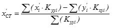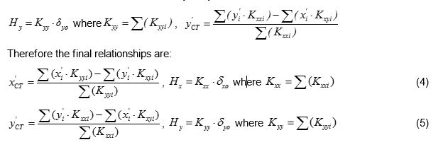 Σ(( x i - x CT ) · Kyyi -( y i - y CT ) · Kxyi )=0 -Σ( y i · Kxyi )+ y CT · Σ( Kxyi )+Σ( x i · Kyyi )- x CT · Σ( Kyyi )=0.