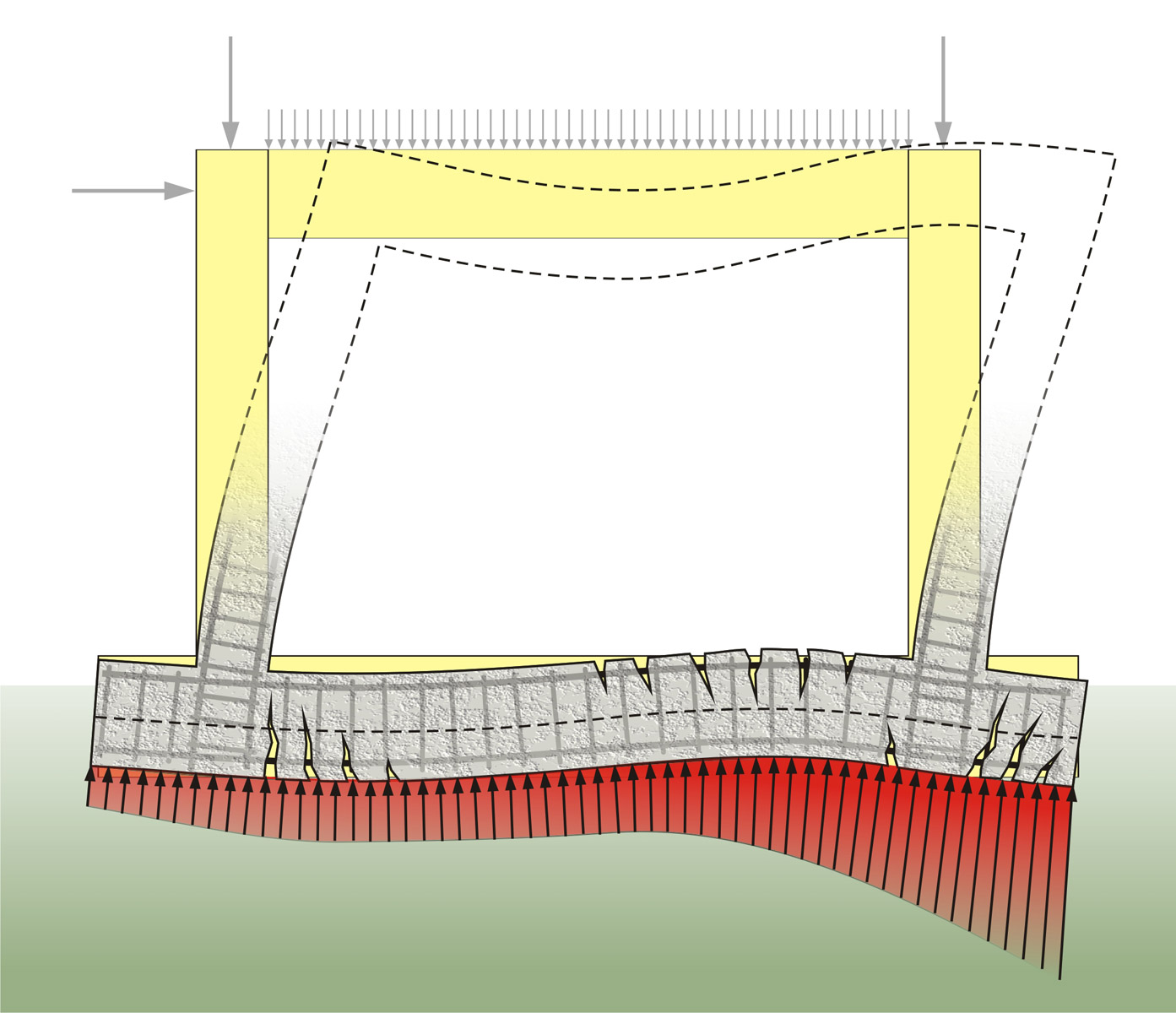 Κατά τη διάρκεια του σεισμού, το ένα άκρο επιβαρύνεται, δημιουργώντας μεγαλύτερες τάσεις στο έδαφος, ενώ παράλληλα το άλλο άκρο ανακουφίζεται. Όταν αλλάξει κατεύθυνση ο σεισμός, αλλάζει συμμετρικά και η επιβάρυνση των πελμάτων. Η παραμόρφωση και η ένταση της πεδιλοδοκού είναι ισχυρή και διαρκώς εναλλασσόμενη.