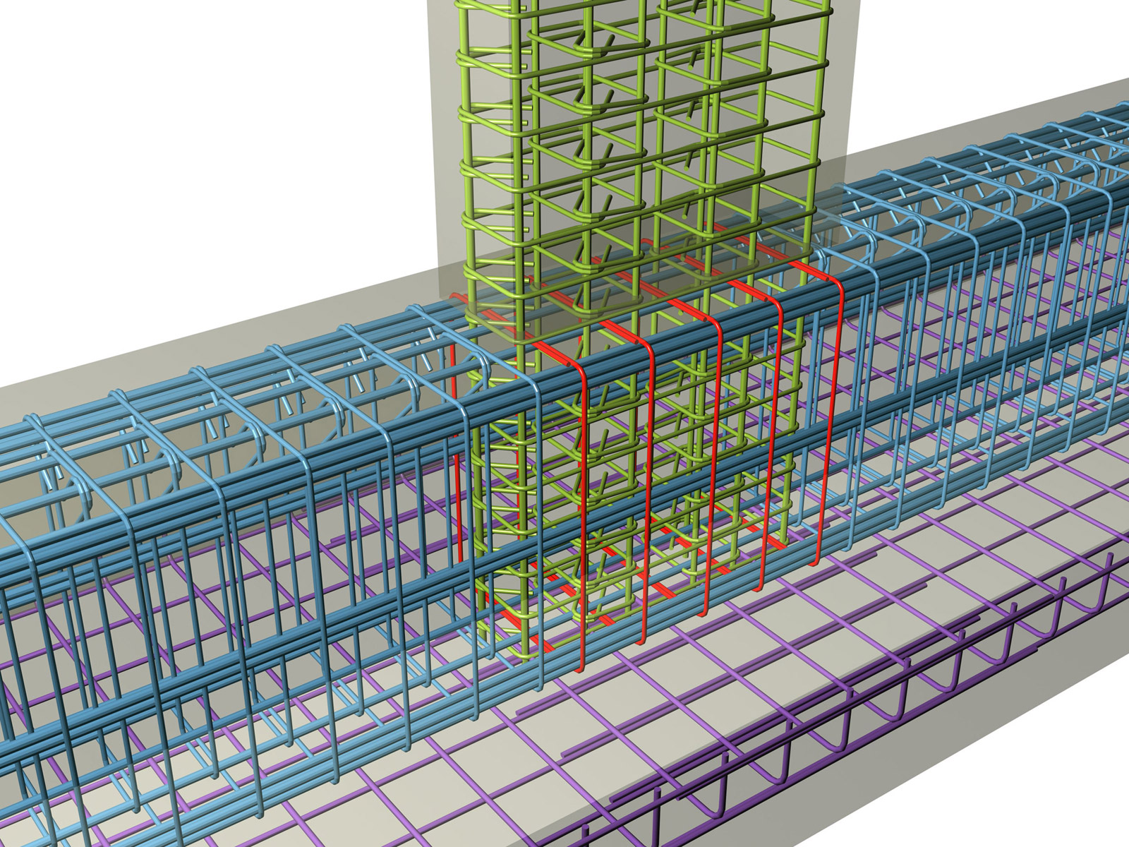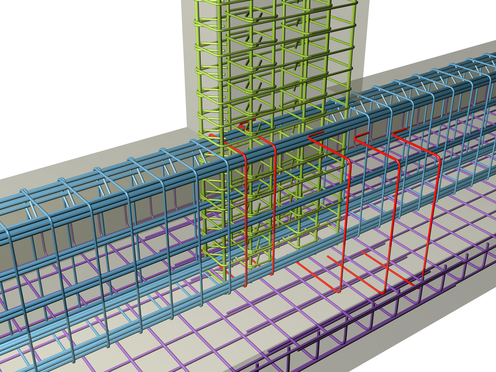 Κατά την τοποθέτηση των κλωβών των συνδετήρων στους κορμούς των πεδιλοδοκών, παραμένουν χωρίς εγκάρσιο οπλισμό τα τμήματα του κορμού που προεξέχουν του υποστυλώματος. Οι διπλές φουρκέτες (κόκκινο χρώμα) που θα τοποθετηθούν σ’ αυτή την περιοχή κατασκευάζονται και τοποθετούνται χωριστά.