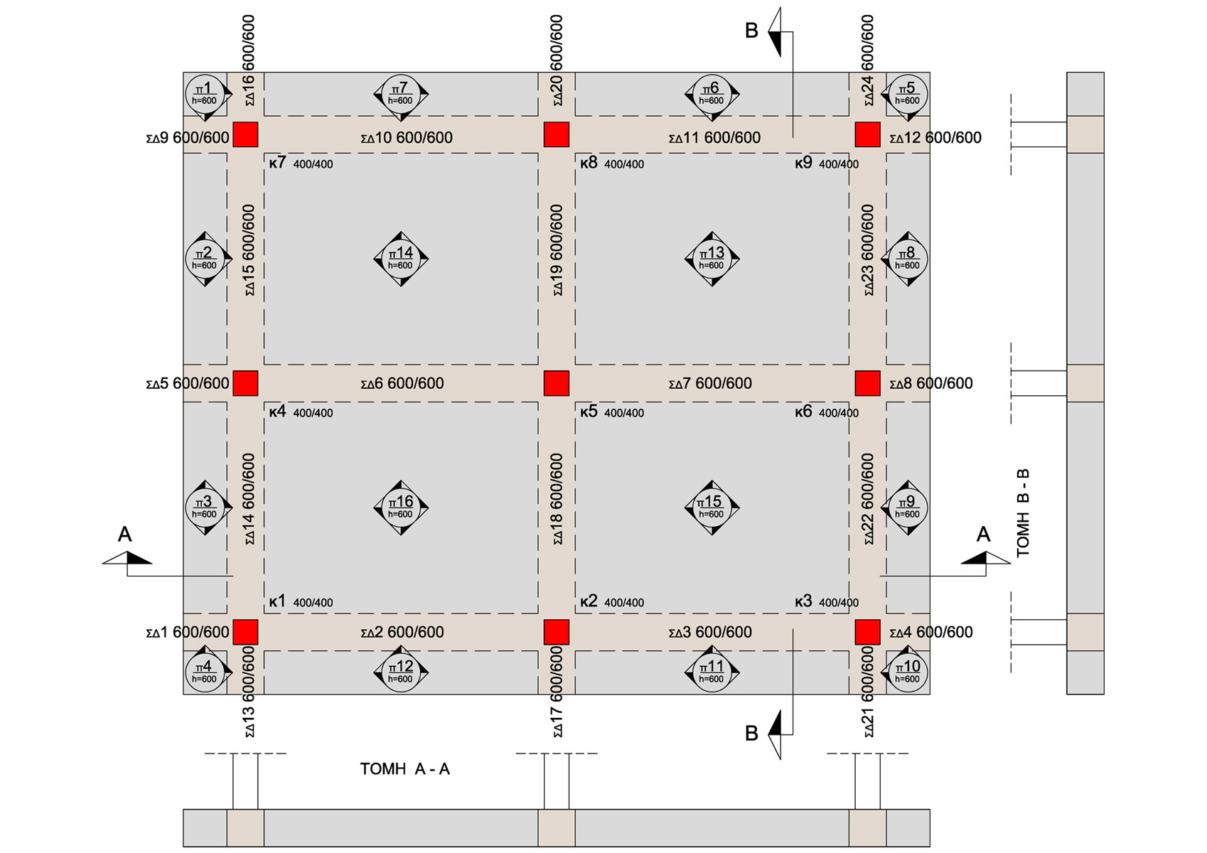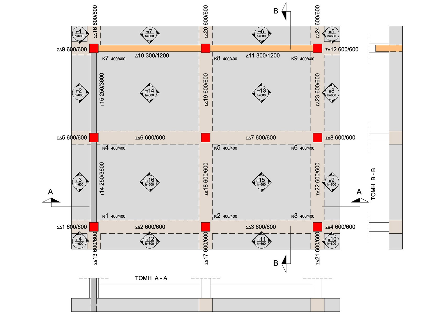(γ) όπλιση διάτρησης (όταν απαιτείται) στην περιοχή κάποιων κολονών (με κόκκινο χρώμα)